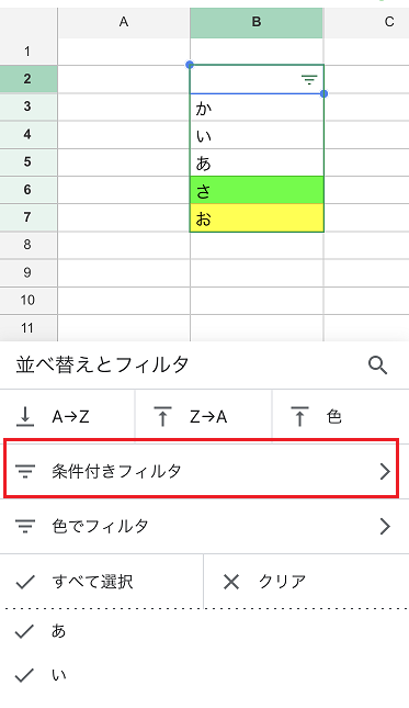 5、並べ替えとフィルタの選択が可能になりますので、条件付きフィルタを選択します。