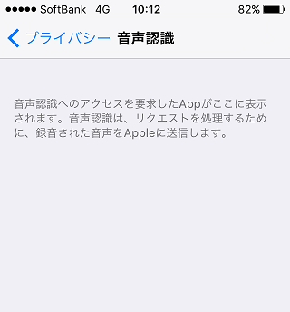 4、音声認識を使用できるアプリの一覧が表示されます。※例ではひとつもありませんが。アプリが表示されている場合、左にスライドしてオフにすれば、アプリは音声認識を使用しない状態になります。