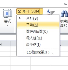 2、ホームタブ⇒オートSUMの下矢印を選択すると、一覧が出るので、その中で平均を選択します。※尚、同様のボタンが数式タブの中にもあります。