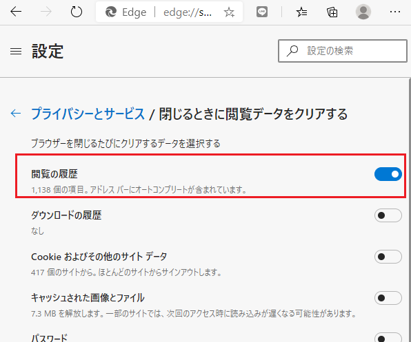 Windows10のChromium版Edgeでブラウザを閉じるとキャッシュ(閲覧履歴)を削除する方法