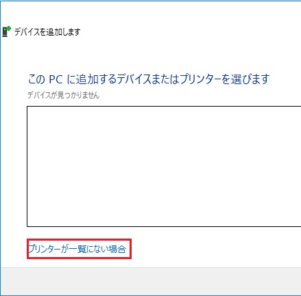 4、以下一般的なプリンタの設定(手動設定)を示す。プリンタの追加を選択後自動検出が始まる。自動検出出来た場合はそれを選択。手動の際は、プリンタが一覧にない場合を選択。