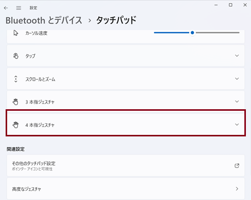 この設定画面にアクセスするには、「設定」>「Bluetoothとデバイス」>「タッチパッド」画面を一番下までスクロールし、「関連設定」の項目にある「高度なジェスチャ」をクリックします。