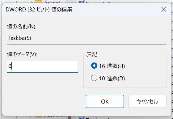 最後に、作成した「TaskbarSi」をダブルクリックし、「値のデータ」を以下の数値に変更することで、タスクバーのサイズを調整できます。